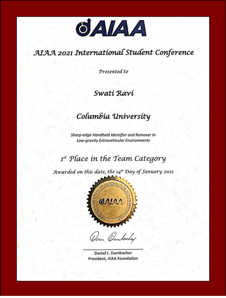 †Dada, N, et al. (6 coauthors including Swati Ravi) “Sharp-edge Handheld Identifier and Remover in Low-gravity Extravehicular Environments” AIAA SciTech Forum, 2021. DOI: 10.2514/6.2021-0579