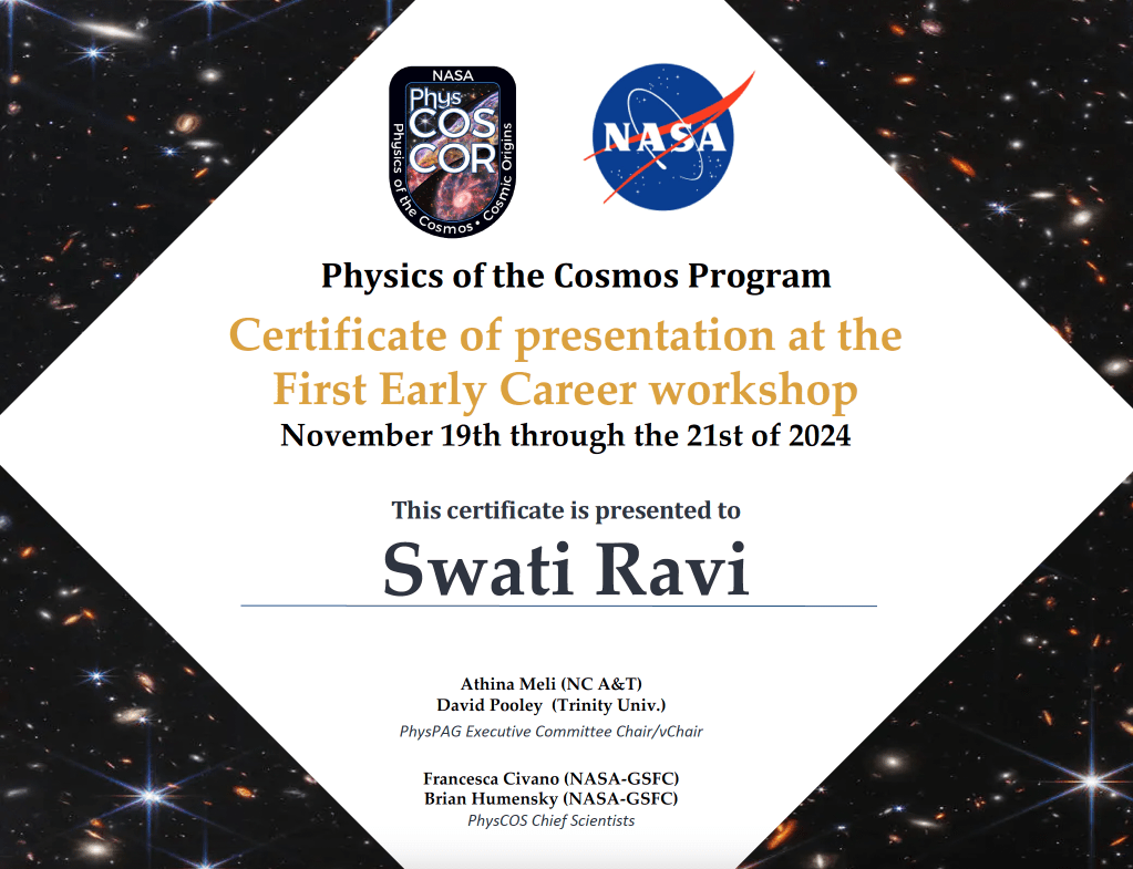 Ravi, Swati “Engineering at the Extremes: NASA Technology Development Across 30 Orders of Magnitude” NASA Physics of the Cosmos Early Career Workshop, 20, November, 2024. Virtual.